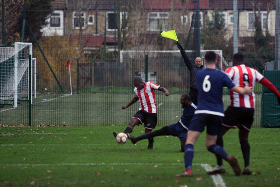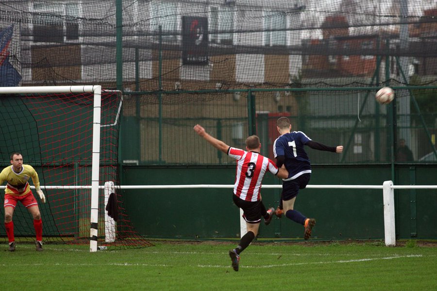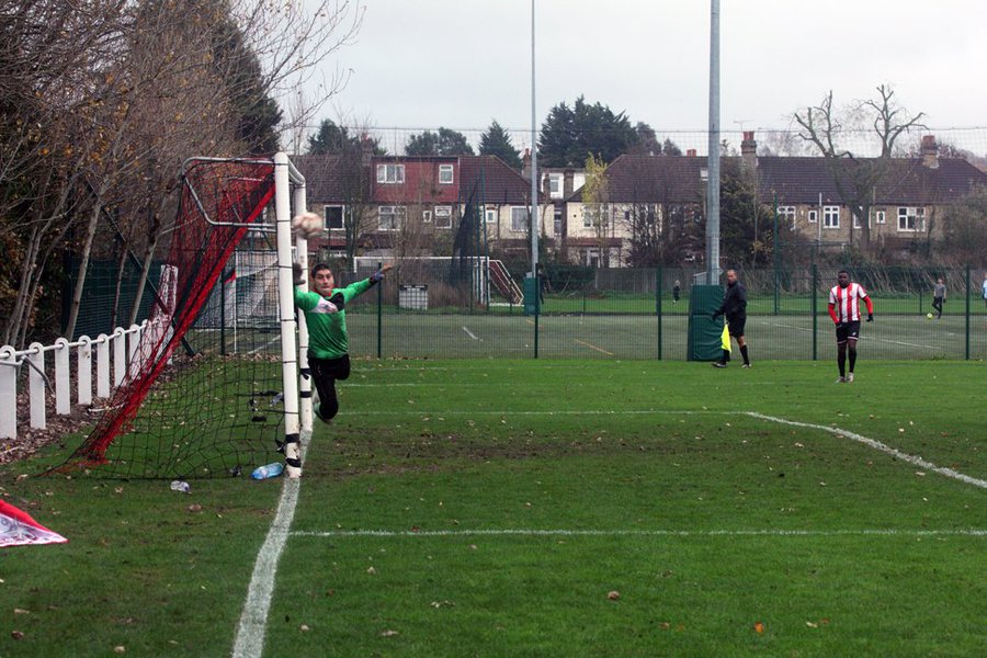The first big chance came for the visitors as their number 9 once again found space in the Clapton area and made a deft turn and volley that went in to Anfossy’s right. However the goal was disallowed for offside.