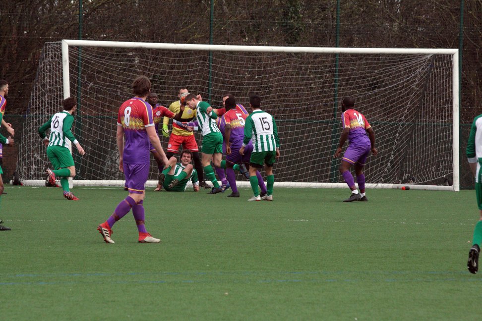 The visitors were a bit shaken by this. From another corner shortly afterwards, the ball was headed against the Clapton bar. A short scramble ensued, but the home team couldn’t force it over.