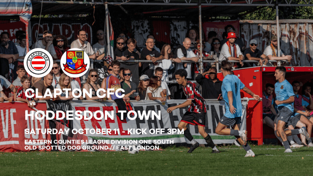 Clapton Community FC vs Hoddesdon Town takes place on Saturday, October 11 2025 with a 3pm kick off at the Old Spotted Dog Ground, 212 Upton Lane, Forest Gate, East London, E7 9NP.