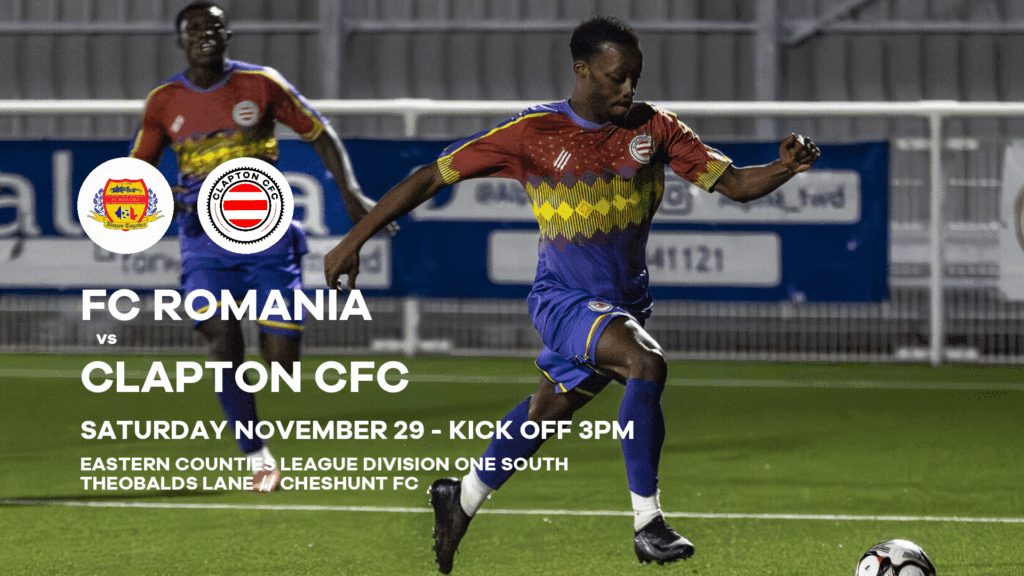 FC Romania vs Clapton Community FC takes place on Saturday, November 29 2025 with a 7.45pm kick off at Theobalds Lane, Cheshunt, Waltham Cross EN8 8RU