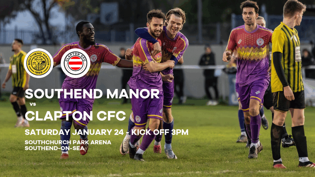 Southend Manor FC vs Clapton Community FC takes place on Saturday, January 24 2026 with a 3pm kick off at Southchurch Park Arena, Northumberland Crescent, Southend-on-Sea SS1 2XB.