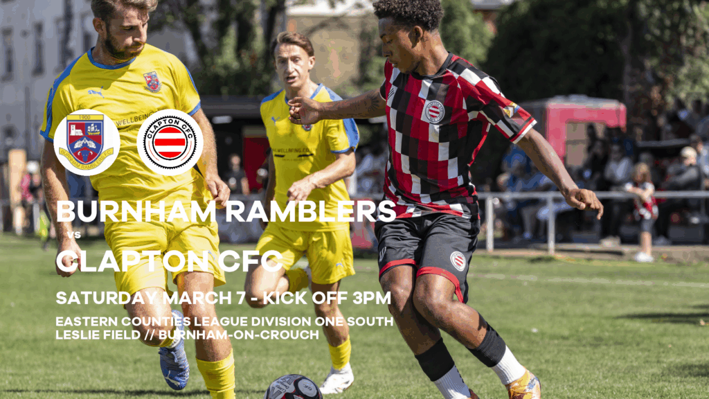 Burnham Ramblers vs Clapton Community FC takes place on Saturday, March 7 2026 with a 3pm kick off at the Leslie Field Stadium, Springfield Road, Burnham-on-Crouch, Essex CM0 8TE