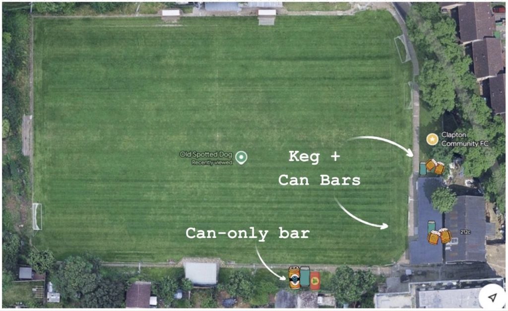 Keg and cans are available at the Clubhouse bar and the bar next to the clubhouse, while the Ham Park Road stand bar will be can only.