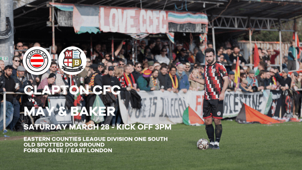 Clapton Community FC vs May & Baker Eastbrook takes place on Saturday, March 28 2026 with a 3pm kick off at the Old Spotted Dog Ground, 212 Upton Lane, Forest Gate, East London, E7 9NP.